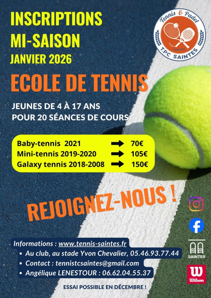 Inscription mi-saison Ecole de tennis Janvier 2026 Navigation de l’article Previous Previous post: Soirée membresNext Next post: Tournois Padel Décembre 25 / Janvier 26