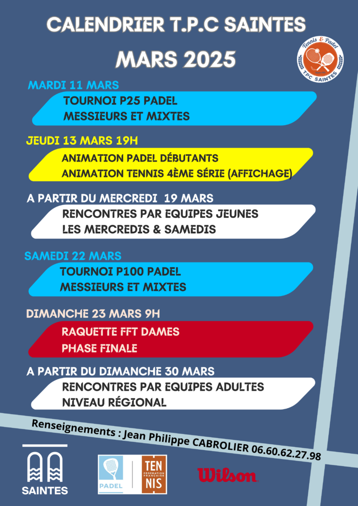Calendrier club Mai 25 Voici le calendrier du mois de MAI -Tennis et Padel – A très bientôt sur les courts ! Navigation de l’article Previous Previous post: Cours collectifs de PadelNext Next post: Animation découverte Padel débutants juillet/septembre