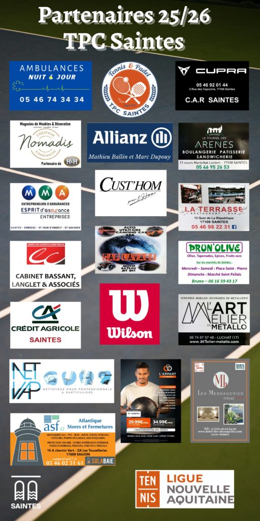 Le Club de Tennis & Padel de Saintes remercie ses partenaires pour leur confiance. Ils nous accompagnent pour le développement du club pour la saison 2025 / 2026