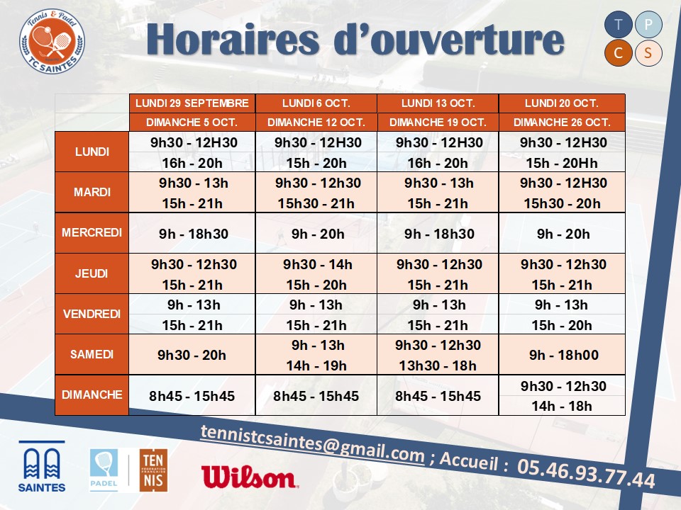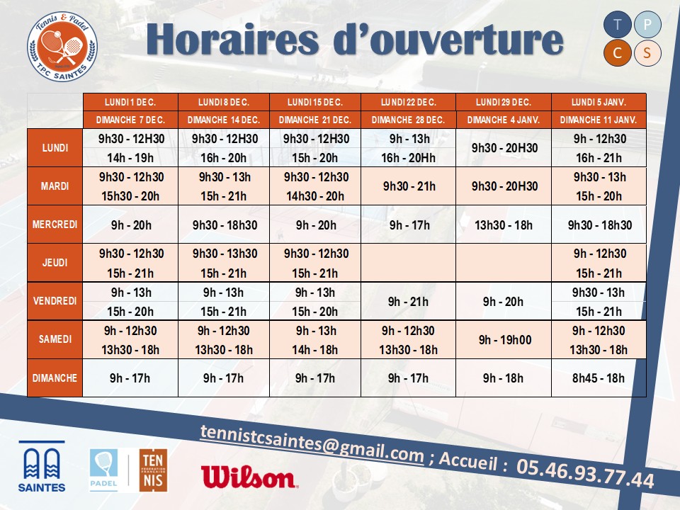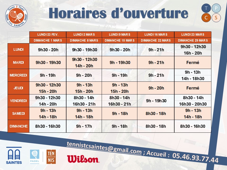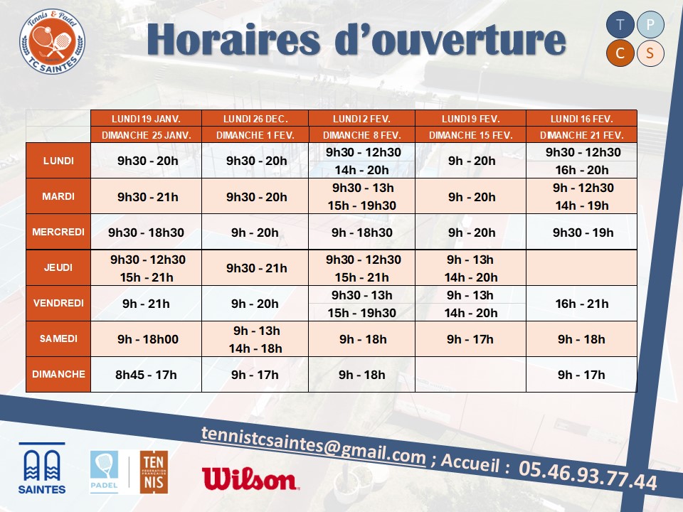Notre club house est composé de vestiaires, d’un bar, d’un pro shop (Raquettes, cordages, textiles, balles…) et de panneaux affichages et d’un téléviseur pour vous informer. Les horaires d’ouverture sont variables selon les évènements et l’activité du club. Deux personnels d’accueil sont aux services des membres et des joueurs (05.46.93.77.44)